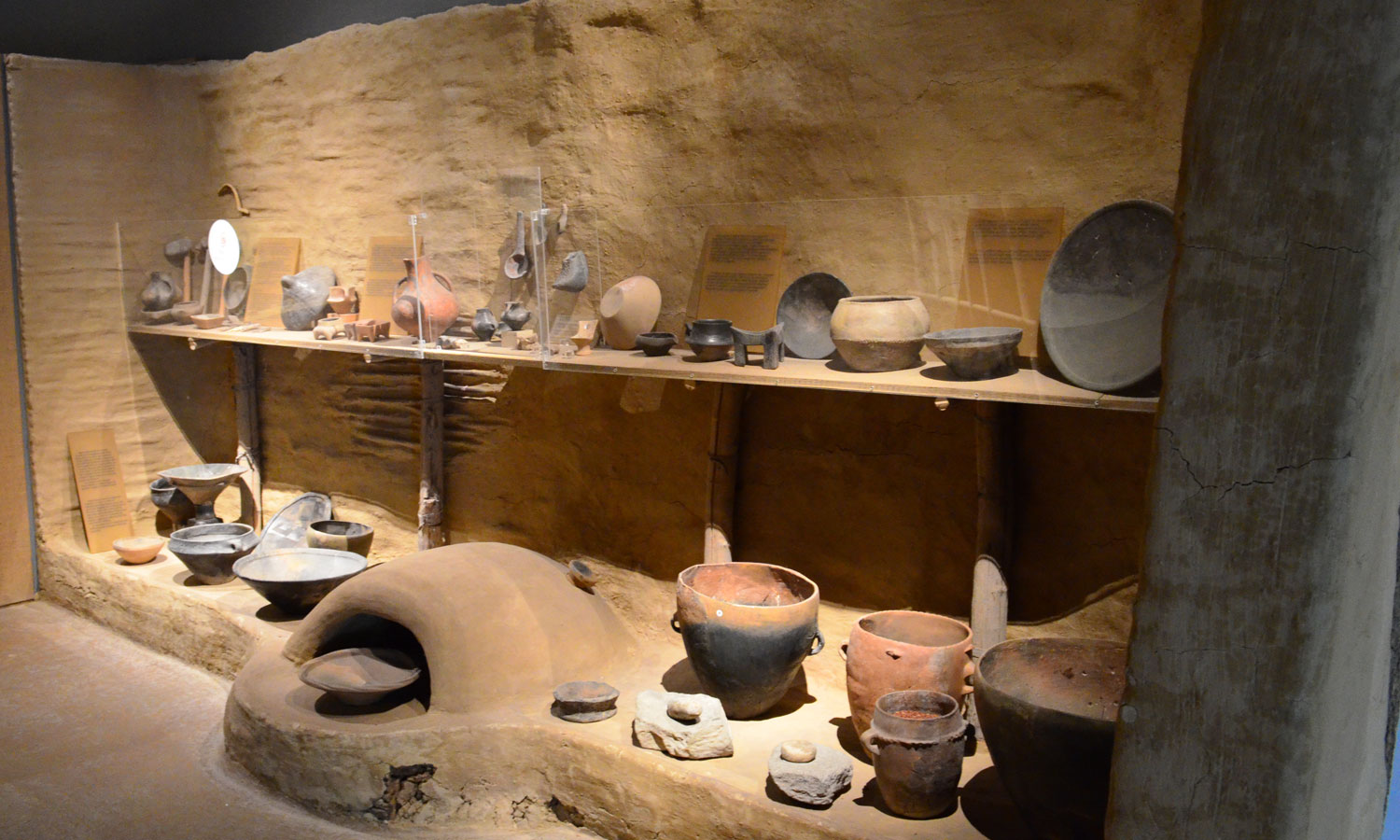 Ο εκθεσιακός χώρος αποτελείται από τρεις κύριες αίθουσες. Στην πρώτη τα αρχαιολογικά ευρήματα μαρτυρούν την παρουσία των νομάδων κυνηγών της Μέσης Παλαιολιθικής Εποχής στο σπήλαιο Πηγών του Αγγίτη, τη ζωή στους μόνιμους γεωργοκτηνοτροφικούς νεολιθικούς οικισμούς και το πέρασμα στη χαλκοκρατία στην πόλη της Δράμας και στη θέση Σιταγροί. Η αναπαράσταση μιας νεολιθικής κατοικίας με ευρήματα, που περιγράφουν τις δραστηριότητες του νεολιθικού ανθρώπου και την καθημερινή του ζωή, αποτελεί το κέντρο του ενδιαφέροντος των επισκεπτών κάθε ηλικίας. Στην ίδια αίθουσα συνεχίζεται το ταξίδι στο χρόνο στην εποχή του Σιδήρου και στους μετέπειτα χρόνους, όπου είναι κυρίαρχη η λατρεία του θεού Διόνυσου μέσα στην πόλη της Δράμας, στην Καλή Βρύση και σε άλλες περιοχές του νομού.